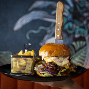 wołowina 100% (250 g), cheddar, camembert, maliny, bekon, cebula karmelizowana, rukola, pomidor, ogórki konserwowe, czerwona cebula, sos żurawinowy, sos burgerowy